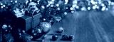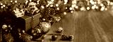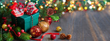 Christmas Green gift box with plaid ribbon, red and gold ornaments, and twinkling lights on a wood surface.