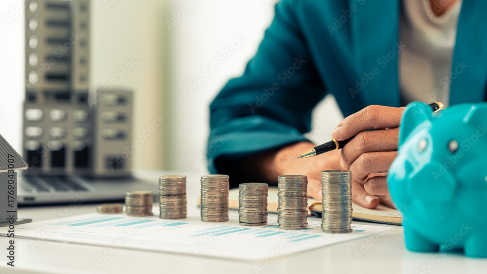 Business concept of accounting, investing and finance. Stack coins into a piggy bank to save money. Plan and save for the future and retirement fund.