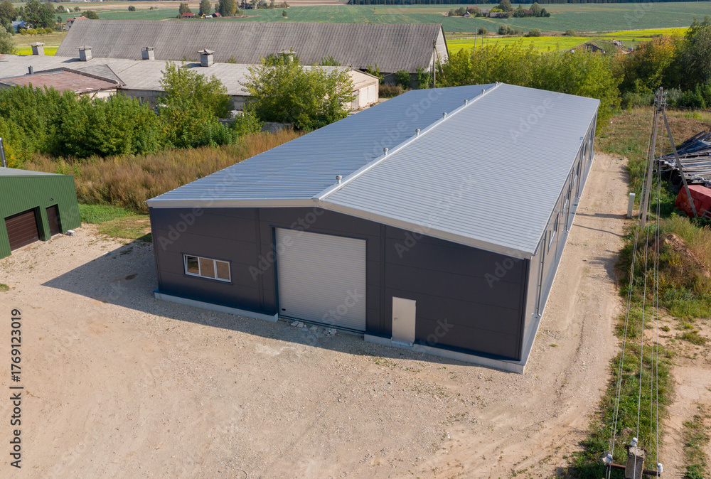 Modern Industrial Farm Warehouse Building in a Rural Area Aerial View