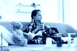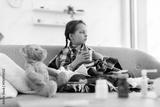 A young girl, wrapped in a blanket, sits on a sofa, holding a mug while looking away. Medicine and a teddy bear are nearby, suggesting illness.
