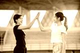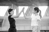Pretty asian woman in sportswear clapping hands high five with friend while exercising in a stadium.