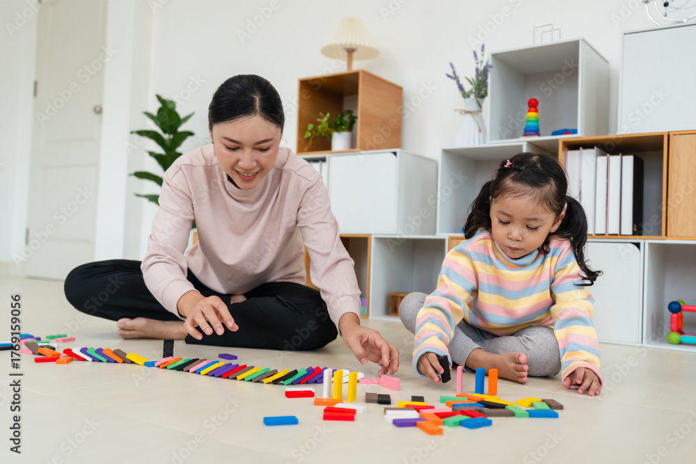 toddler girl and mother playing colorful wooden block toy or domino game together