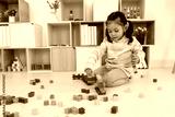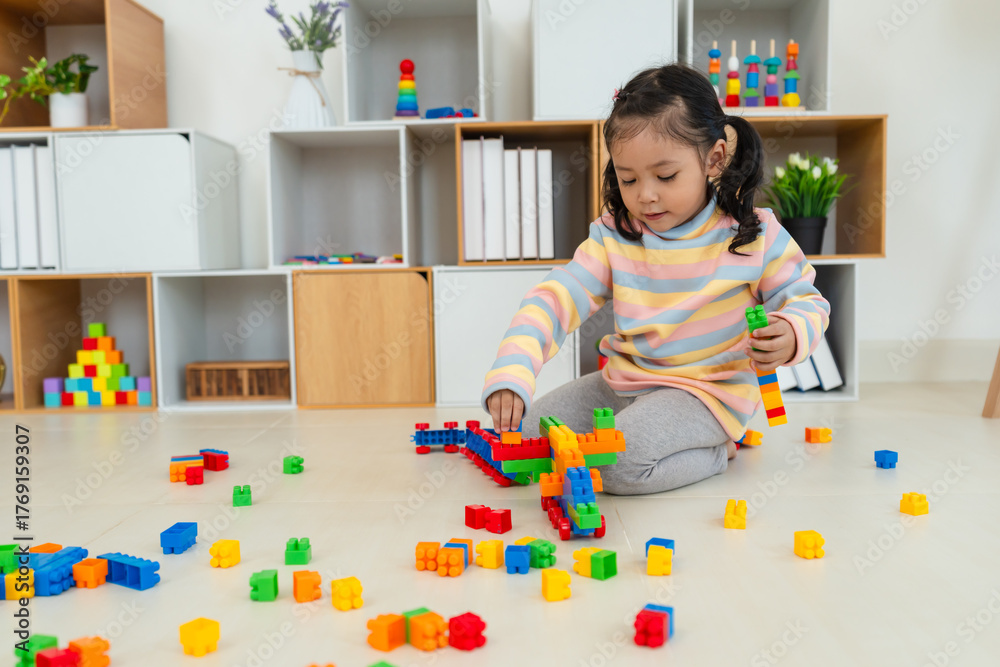 toddler girl playing building blocks or plastic bricks toy at home
