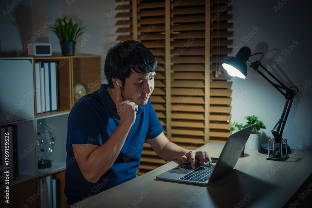 happy young man using wireless earbuds to listening music and laptop at night