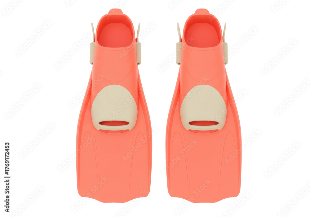 Isolated swimming fins for water sports and recreation, pair of short coral-colored flippers