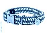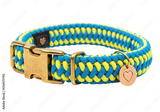Isolated pet collar braided in blue and yellow, with metal buckle and heart shaped pendant