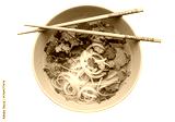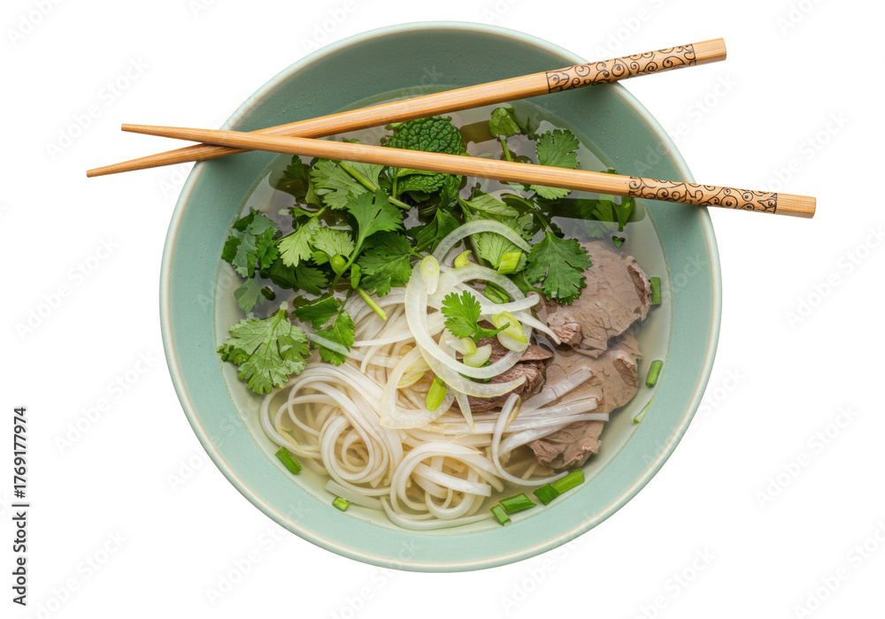 Isolated bowl of traditional Vietnamese Pho soup with noodles, meat, and fresh herbs