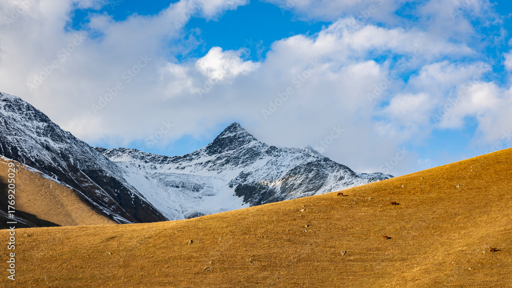 Landscape view of Snow-capped peak mountain Above Golden Slope