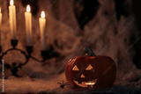 Halloween composition with Jack o`lantern on black grunge background