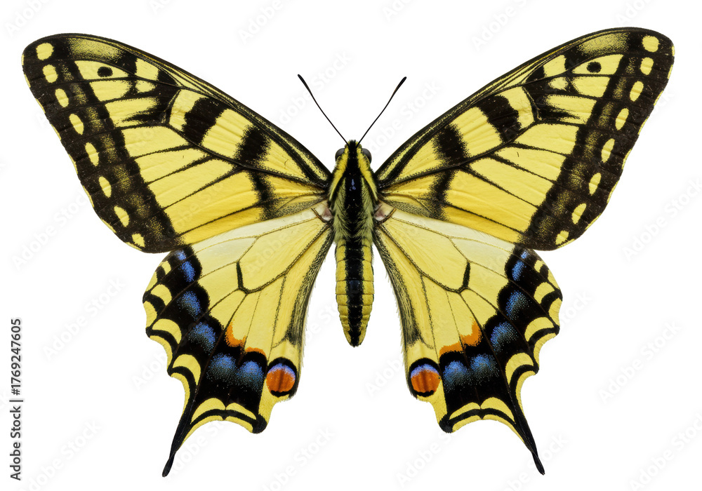Isolated butterfly, colorful wings, Papilio glaucus, bright yellow insect with black markings