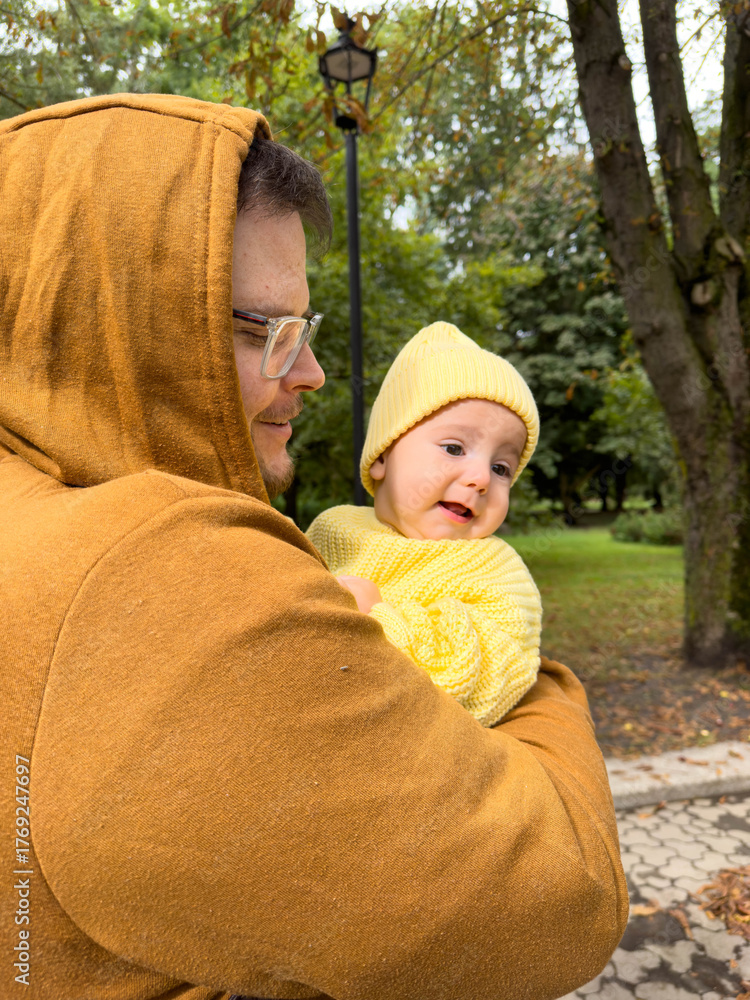 Man Holding Baby in Yellow Outfit Outdoors Autumn season