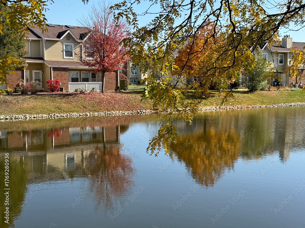 A peaceful autumn scene with houses reflecting in a calm pond surrounded by colorful fall trees