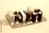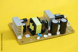 Electrical circuit board. Power supply board unit for electronics isolated on yellow background.