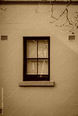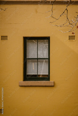 Vertical image of the building exterior of a yellow house with isolated window outdoor at daytime during winter in the historic neighbourhood the Rocks in Sydney in Australia.