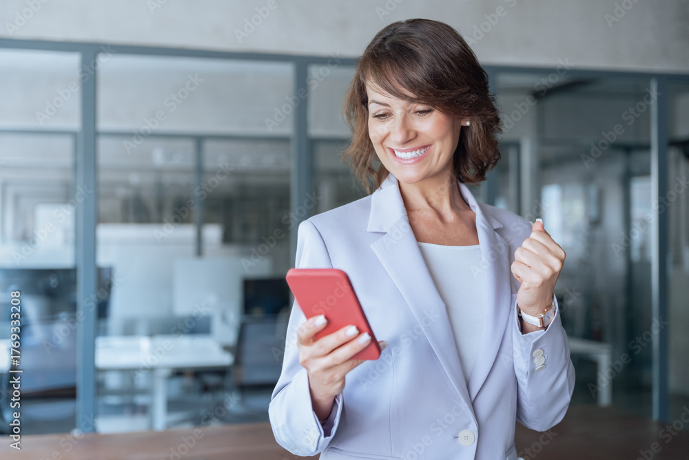 Excited trader businesswoman in suit doing winner gesture, reading investment news. Happy business woman looking on smartphone mobile phone gesturing yes winning pose standing in office. Copy space