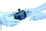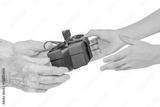 Close-up of elderly and young hands exchanging a blue gift box with a red ribbon, isolated on white. Symbolic concept of giving, care, gratitude, connection, family love between generations.