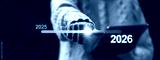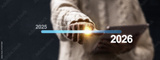 Female hand with tablet slides the loading bar from 2025 to 2026 on a virtual screen. Happy New Year concept or Celebration