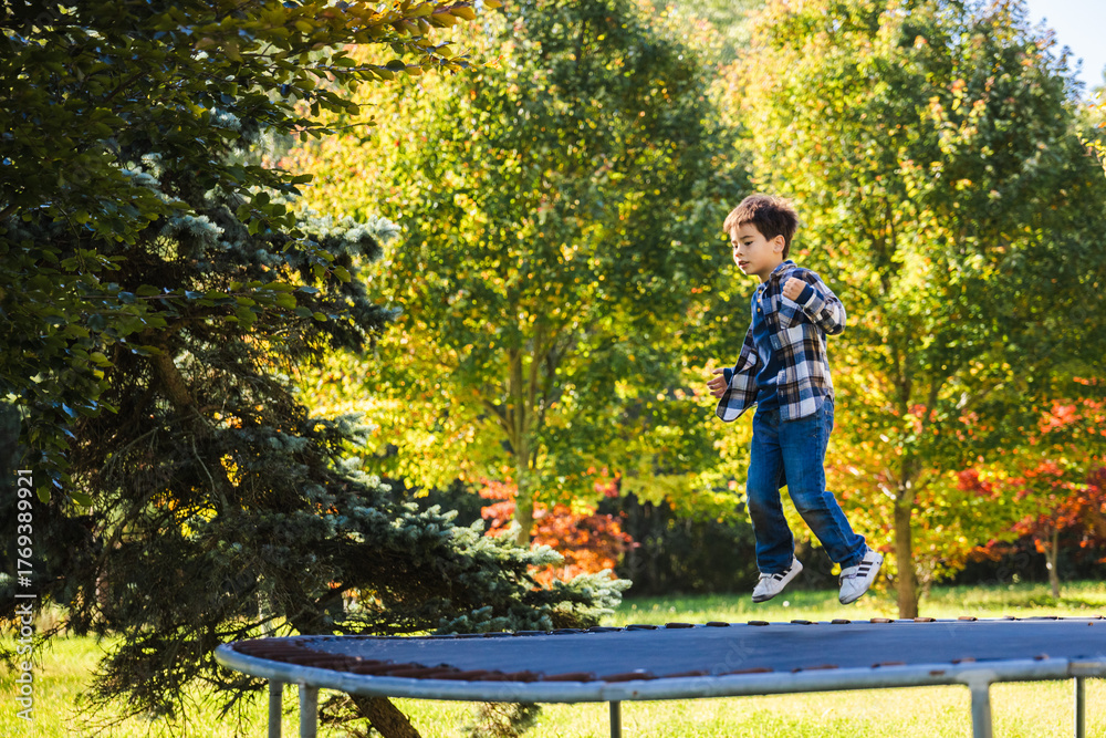 Smiling boy jumping on a trampoline in the garden surrounded by autumn trees and bright sunlight