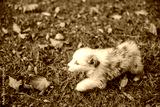 Australian Shepherd puppy with blue eyes walking through fallen autumn leaves on green grass, fluffy merle-colored dog outdoors in park