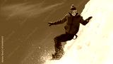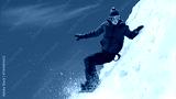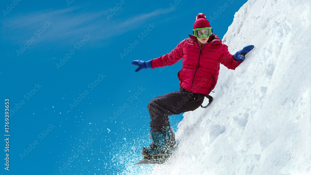 Snowboarder descending steep snowy slope under bright blue winter sky. Concept of motion, control, determination for lifestyle branding, seasonal campaigns, and visual metaphors. Handmade collage