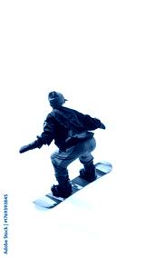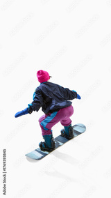 Female snowboarder in bright retro suit crouching on board isolated on white studio background. Concept of motion form, energy, and control for visual identity, and creative movement design.