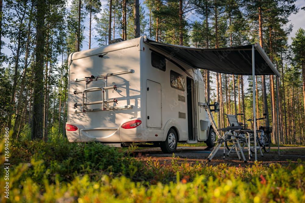 Family vacation travel RV, holiday trip in motorhome, Caravan car Vacation. Beautiful Nature Norway.