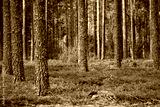 Serene and peaceful forest scene with tall trees and lush green grass.