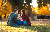 Romantic young multiracial couple enjoying a date in an autumn park, sitting on grass drinking tea.