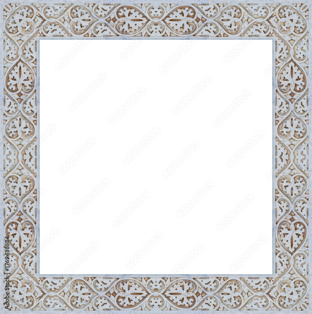 Old carved stone frame, on white background for easy selection, taken from the medieval frieze of the facade of Pisa Cathedral (Italy - Tuscany - Pisa city)