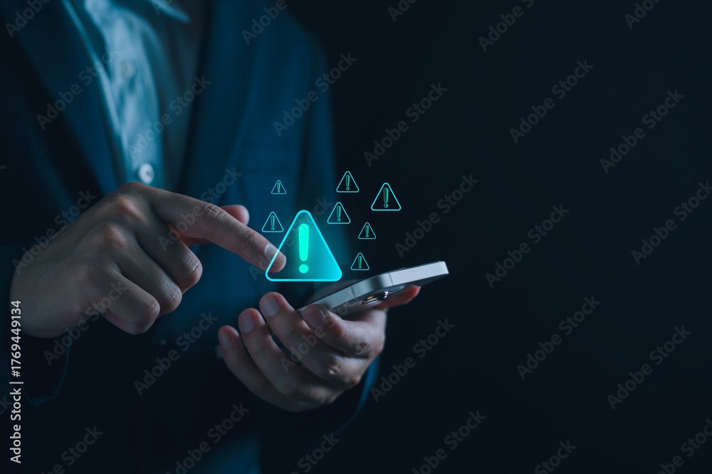 Businessman using computer with system warning alerts, Concept of cyber threat, phishing, scam messages, suspicious calls, and online security risks on communication.
