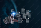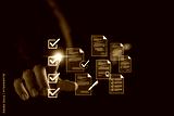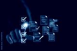 Checklist business performance monitoring concept, Businessman doing online survey filling out check digital form task, online survey question form, target marketing planning with quality control.