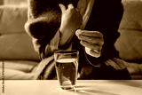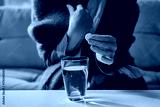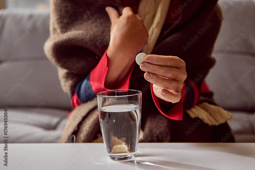 Elderly woman preparing medicine drink with effervescent tablet at home. Concept of pharmacy marketing, self-care instruction, and health prevention.