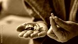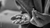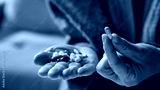 Elderly woman holding single capsule with pills on palm for selection. Concept of pharmacy consultation, dosage choice, and preventive healthcare.