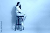 Young smiling woman in casual outfit sitting on a wooden stool against a vibrant pink studio background