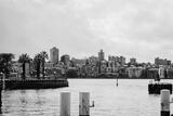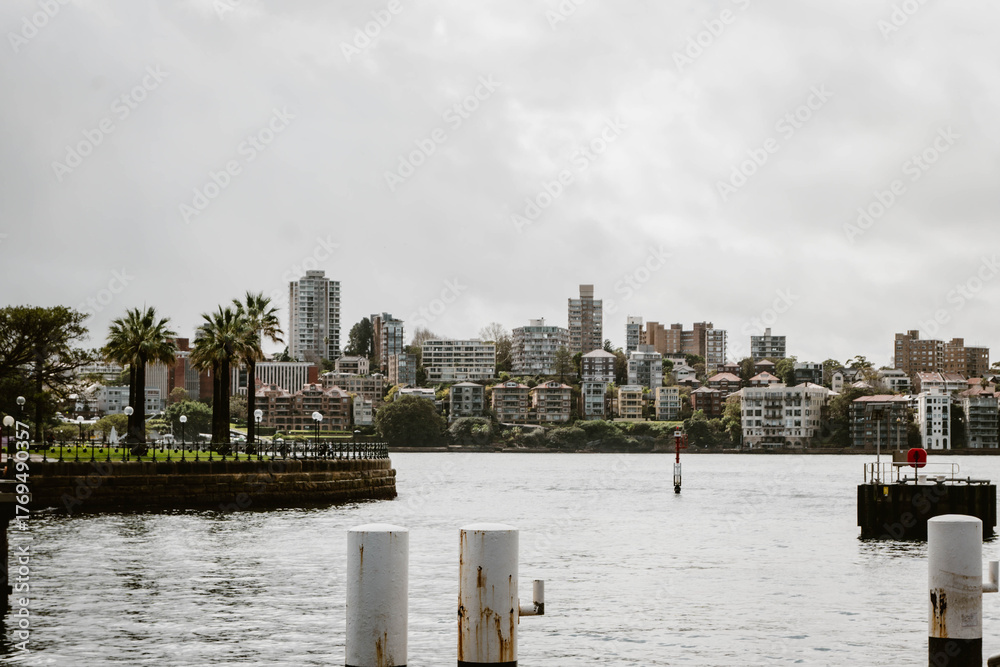 Cityscape of buildings of the Austrlian neighbourhood Kirribilli along the river with the palm trees of Hickson Road Reserve outdoor at daytime during winter in Sydney in Australia.