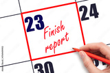 23 rd day of the month. Hand writing Finish report reminder and drawing red frame on calendar with red pen on white background. Business concept. Planning and scheduling