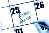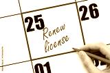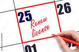 25 th day of the month. Hand writing Renew license reminder and drawing red frame on calendar with red pen on white background. Business concept. Planning and scheduling