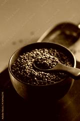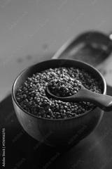Buckwheat groats in a wooden bowl with a wooden spoon on a textured surface