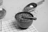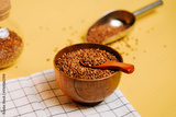 Buckwheat groats in a wooden bowl with a small spoon on a yellow background