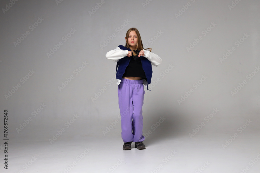 Young caucasian female teen in casual outfit on grey background