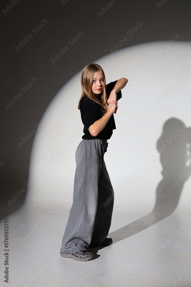 Young caucasian female performing dance pose in studio with spotlight