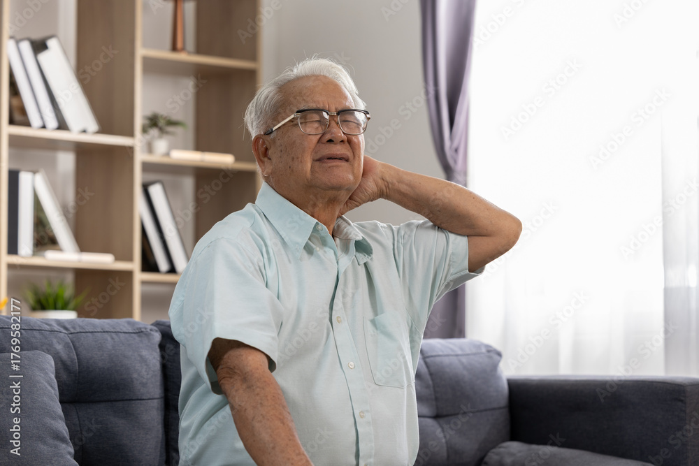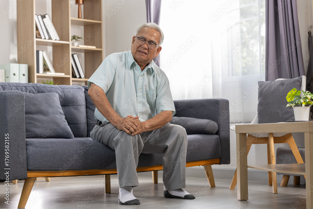 Asian Elderly man sitting on sofa holding knee in pain, living room with bookshelf and plant, natural light, moment of discomfort and concern