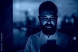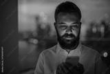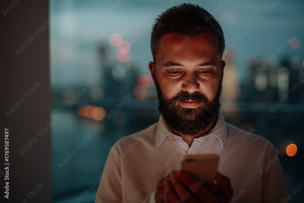 Businessman texting on smartphone, standing by window.
