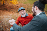 Older man and his son holding hands, sittin on bench by lake and talking.