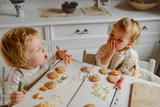 Happy children decorating Christmas cookies at home.