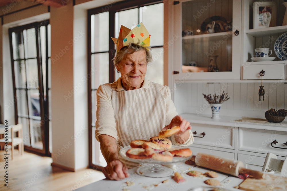 Grandmother with paper crown on head in kitchen.