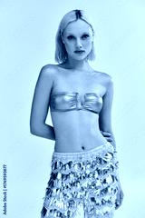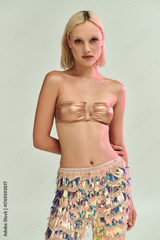 Blonde young woman showcases stylish party outfit with holographic accents in studio