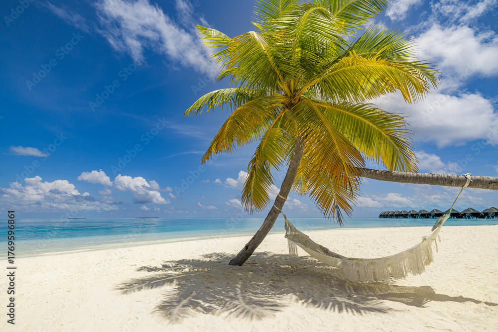 Best Beautiful Summer Maldives Beach Landscape. Top Scenic Villas Tranquil Palm Tree Swing Hammock White Sand. Sunny Blue Sea Relaxing Bright Sky. Luxury Romantic Happy Tropical Holiday Destination