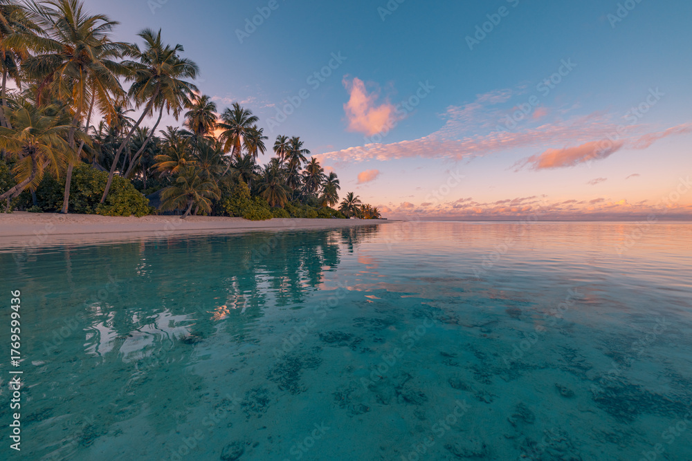 Amazing Sunset Beach Landscape. Perfect Tropical Island Paradise Scenic Reflection. Best Summer Destination Tourism Background Top Gorgeous Relaxing Sea, Top Sky Colors. Beautiful Palm Tree Silhouette
