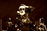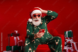 Happy Santa in festive pajama holds a smartphone with gifts and a warm red backdrop capturing Christmas cheer and holiday joy